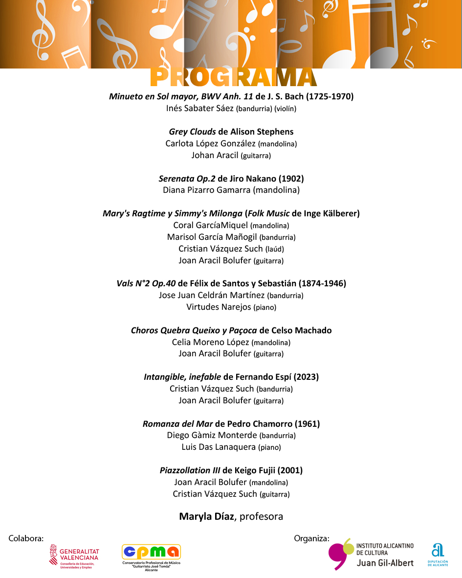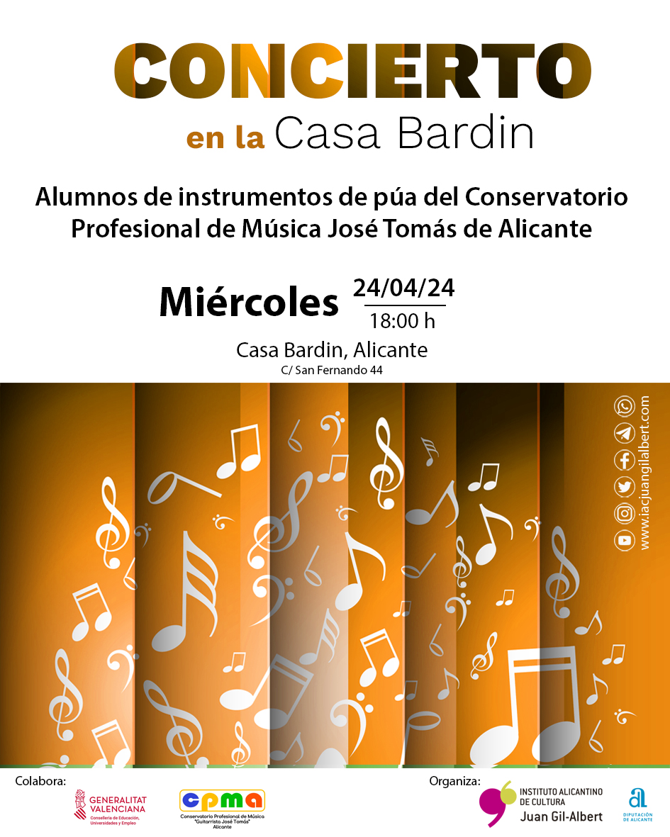 Inicio Agenda Conciertos Música Concierto por alumnos de instrumentos de púa del Conservatorio Profesional de Música José Tomás de Alicante Lugar Casa Bardin, Alicante Categoría ConciertosMúsica Próximo Evento Encuentro con Rosa Rodríguez. Ganadora de Pasapalabra Fecha 05 Mar 2026 Hora 17:00 Fecha 24 Abr 2024 Finalizdo! Hora 18:00 Concierto por alumnos de instrumentos de púa del Conservatorio Profesional de Música José Tomás de Alicante Compartir este evento + Añadir Google Calendar Exportación + iCal / Outlook El evento está terminado.