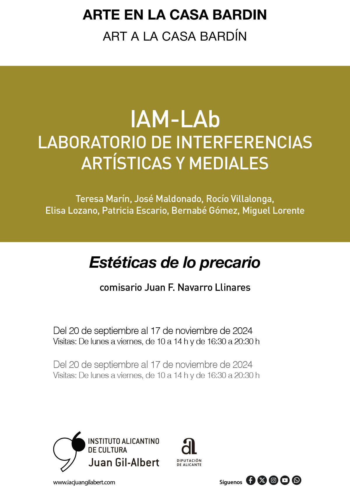 Los autores son los integrantes del Laboratorio de Interferencias Artísticas y Mediales (Equipo IAM.Lab), coordinado por Teresa Marín y formado por José Maldonado, Rocío Villalonga, Elisa Lozano, Patricia Escario, Bernabé Gómez y Miguel Lorente. El proyecto, que se podrá visitar hasta el 17 de noviembre, se materializa como un archivo de lo precario que se vertebra en torno a tres ejes: como archivo/contenedor de un conjunto de fichas con texto e imagen, como un imaginario de la catástrofe que se articula como un mural orgánico y, por último, como documento audiovisual compuesto desde la filosofía de un collage.